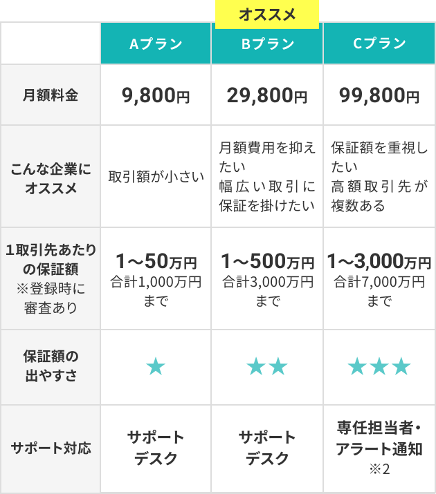 ※1 利用プランの範囲内であれば何社でも保証可能です。 ※2 取引先に新たなリスクが発生したり、経営状況に変化があった場合などにお知らせをします。
