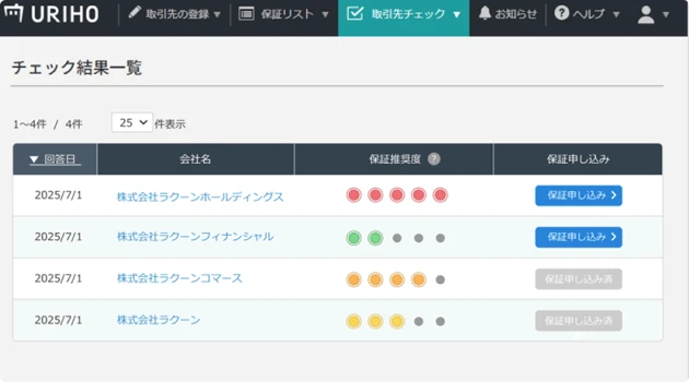 保証推奨度は、URIHOがこれまでに培ってきた保証会社としてのノウハウに基づき、取引先のリスクを診断した結果です。